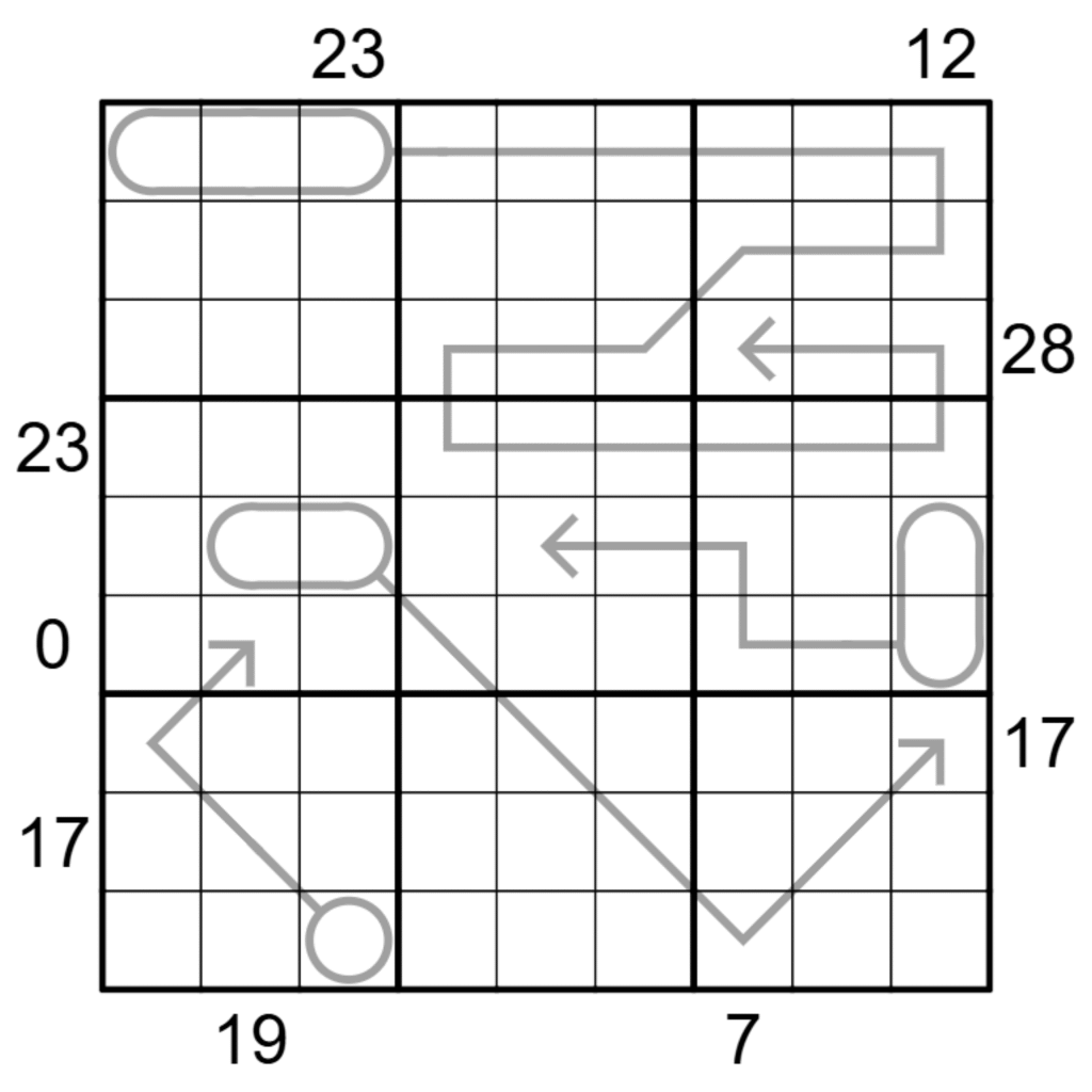 A number lying outside of a row/column indicates the sum of the digits that lie between 1 and 9’s position in that row/column.